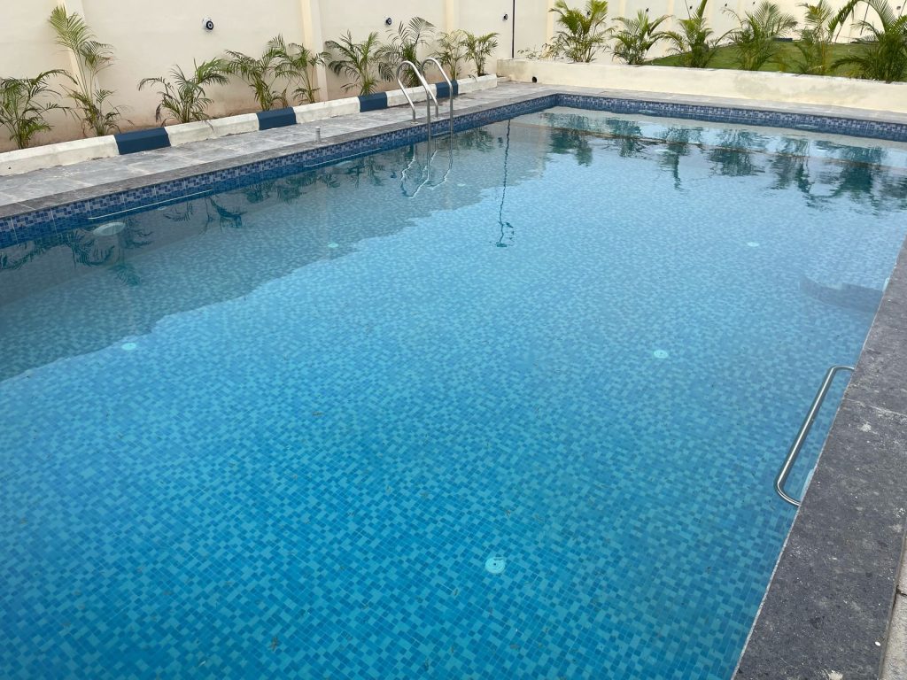 Our pool is clean, well-maintained, and perfect for a refreshing dip. The pool area is tiled and features lounge chairs for relaxation.